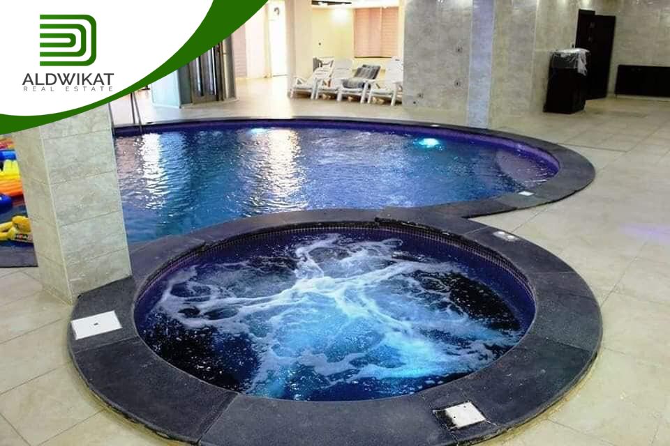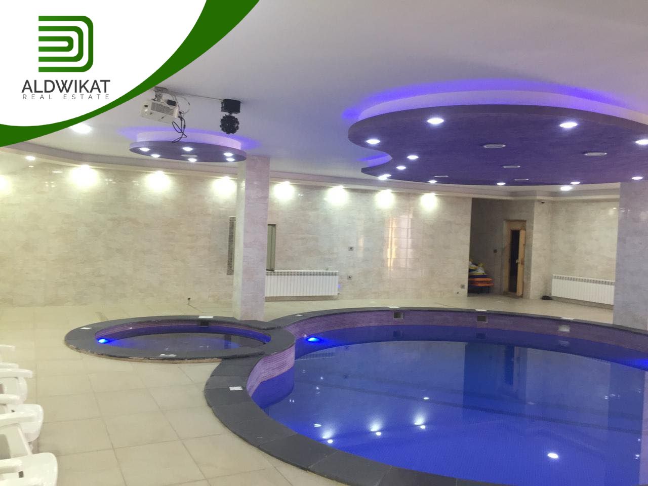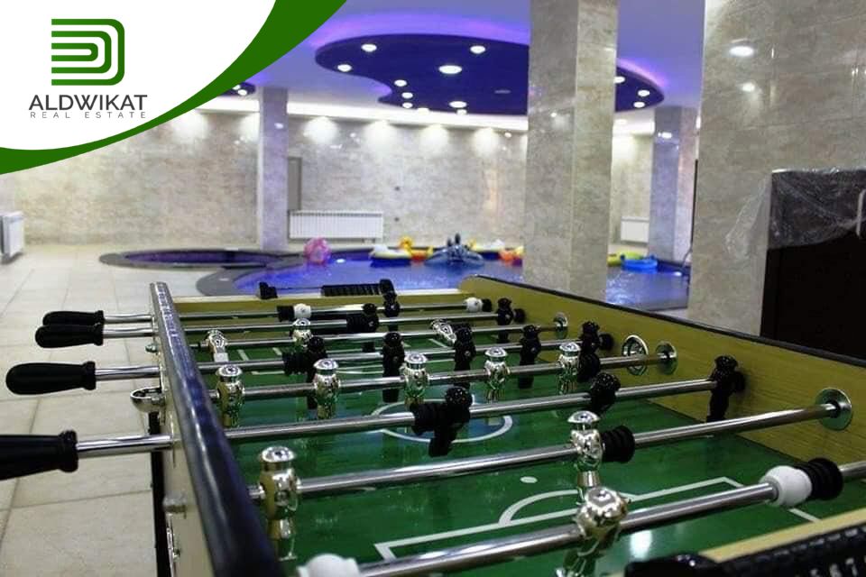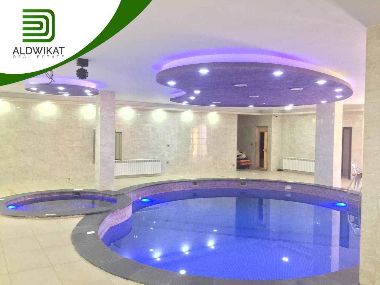 طابق التسوية : بركة سباحة داخلية مدفأه - جاكوزي - ساونا - مطبخ - مساحات للالعاب - منطقة جلوس واسعة - غرفةطعام - مرافق خاصة بالبركة - حمامات و شاورات - غرفة غيار - غرفة تخزين .