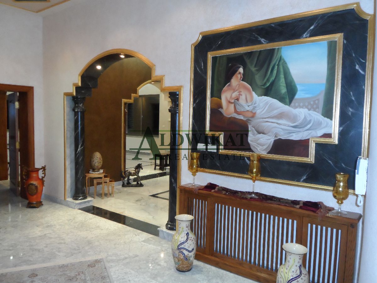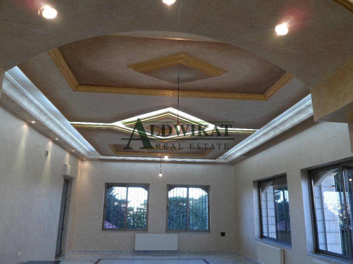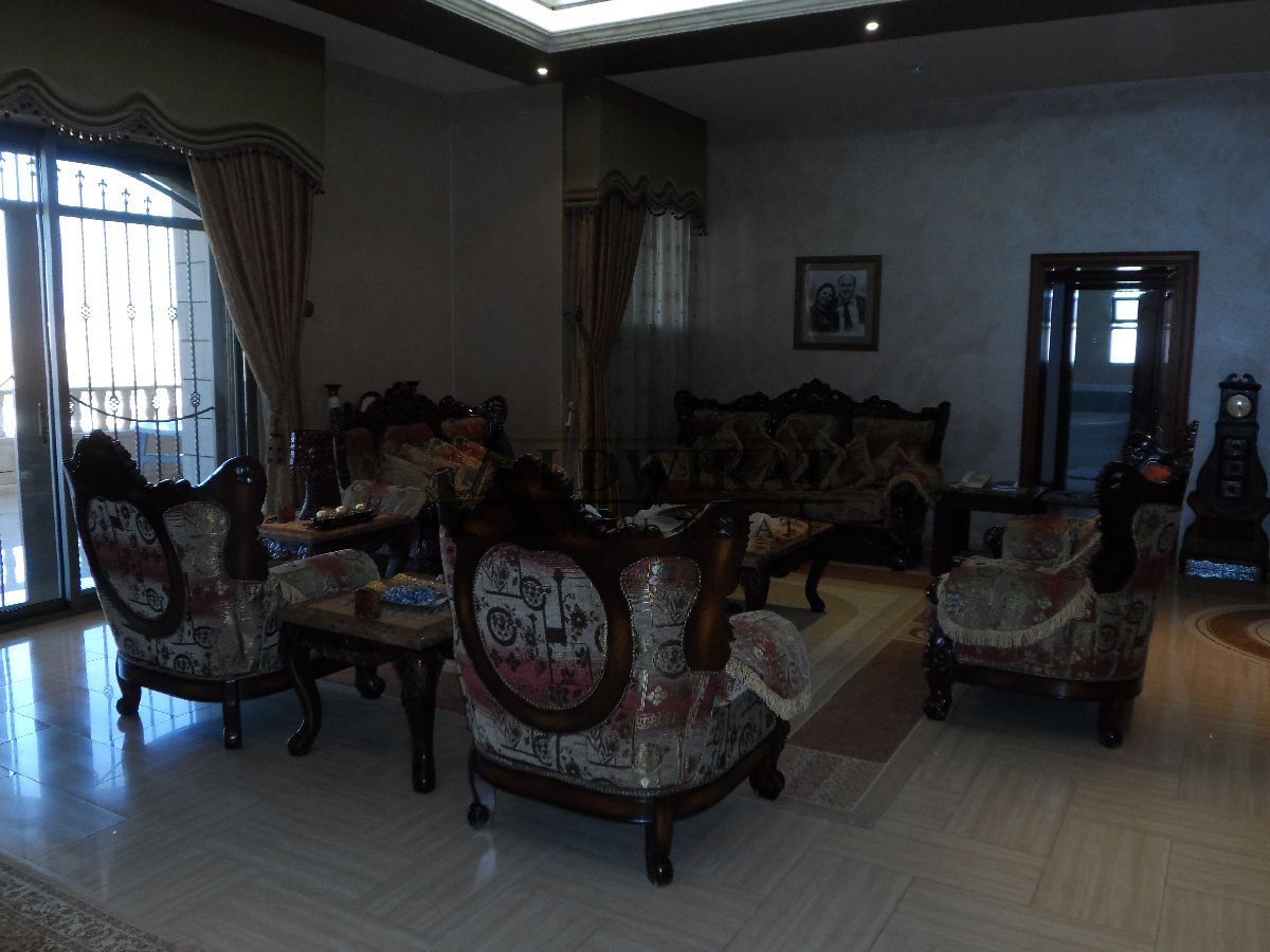 طابق ارضي : مساحه الطابق 650متر + 100 متر تراسات يتكون من غرفه نوم كبيره ماستر و مكتب و 3 حمامات و 5 صالونات و سفره و تراسات . ارتفاع المدخل الرئيسي 9متر . جميع الصالونات مطبعه و مدوكره بورق ذهب