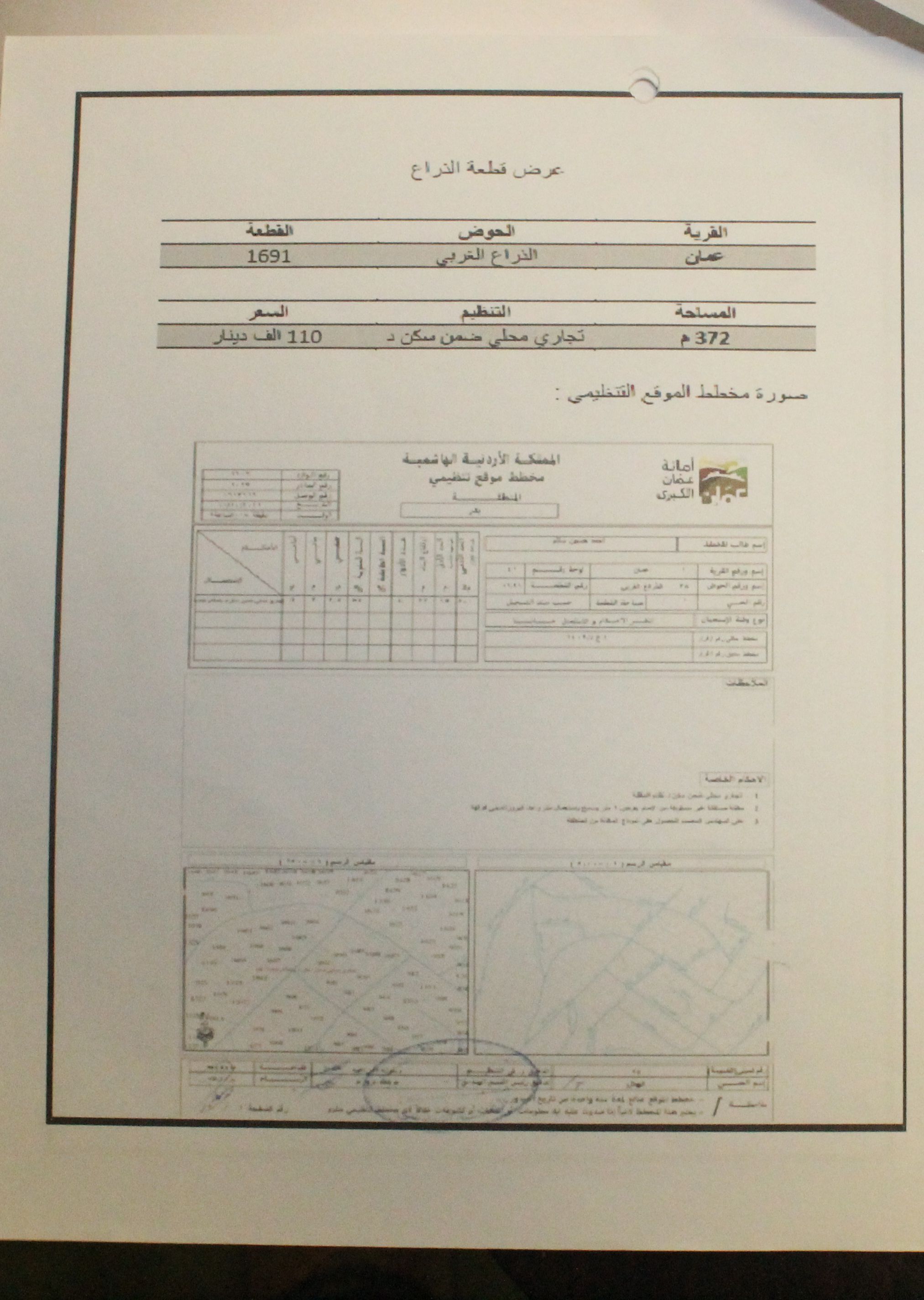 ارض تجاري محلي للبيع في الذراع الغربي ( نزول راس العين ) بمساحة 372م على شارعين التنظيم : تجاري محلي ضمن سكن د تصلح لجميع الاعمال التجارية بسعر : 110 الف دينار----