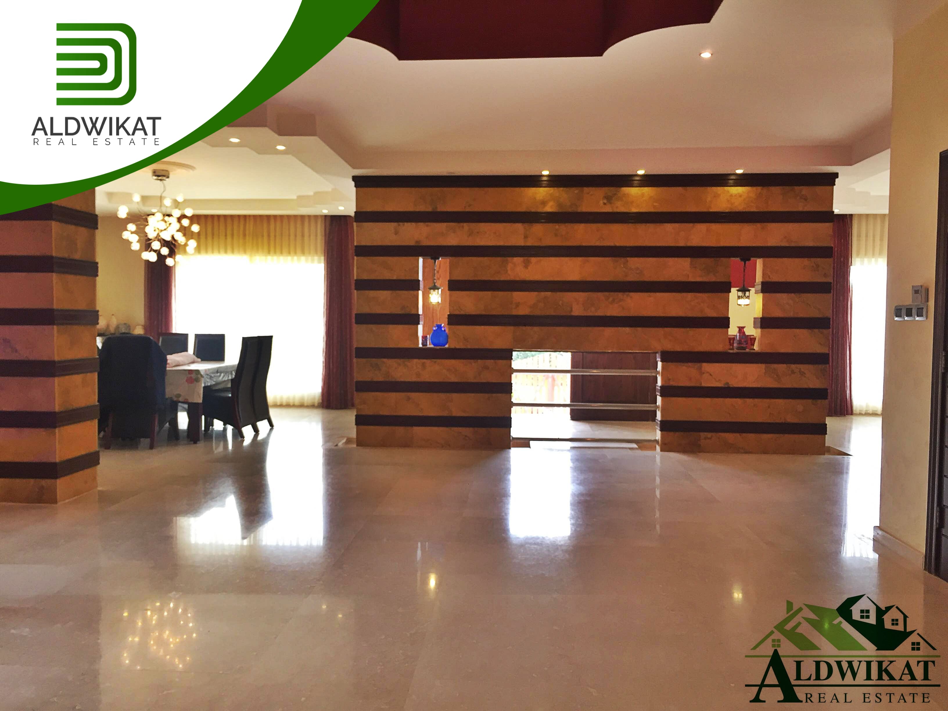 الطابق الارضي مساحته 250 م مكون من : المدخل - صالون واسع - غرفة ضيوف - غرفة معيشة مع فير بليس - غرفة طعام - مطبخ راكب من الطباع - غرفة نوم مع حمامها - حمام ضيوف - ترس - حديقة 380 م - كراج خاص .