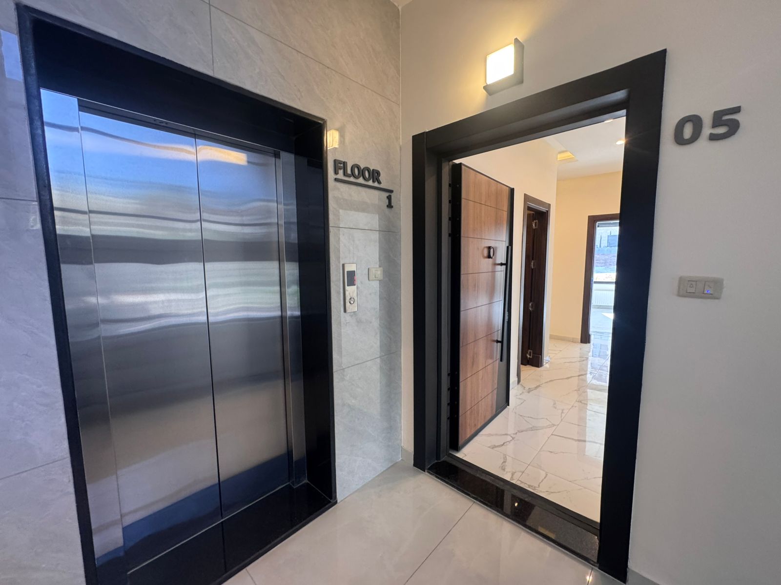 التشطيبات سوبر ديلوكس - نوع الارضيات بورسلان + باركيه - تدفئة غاز -غرفة غسيل - مكيفات - كراج خاص - اطلالة -عدد المداخل 2 - مصعد