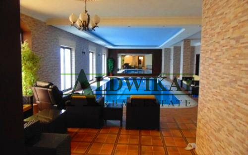 تتكون من : المدخل - صالونات عدد 3 - غرف معيشة 4 - غرف نوم 6 جميعها ماستر - الحمامات عدد 8 - المطابخ عدد 2 - غرفة غسيل - مستودع - تشطيبات سوبر ديلوكس - تدفئة مركزيه تحت البلاط - تكيف مركزي - بركة سباحة داخلية مطلة - ارضيات رخام - خزائن بالحائط - انارة مخفية - سبوت لايت - موقد - ديكورات جبصين - اباجورا كهرباء - ترس - حديقة جميلة - كراج خاص - بئر ماء - منطقة جميلة - عدد المداخل 2.