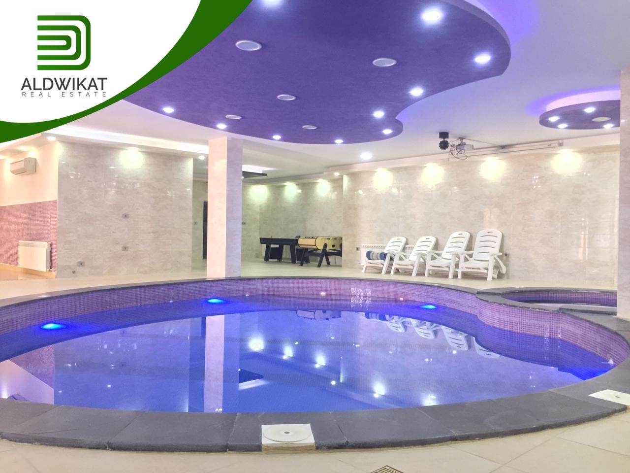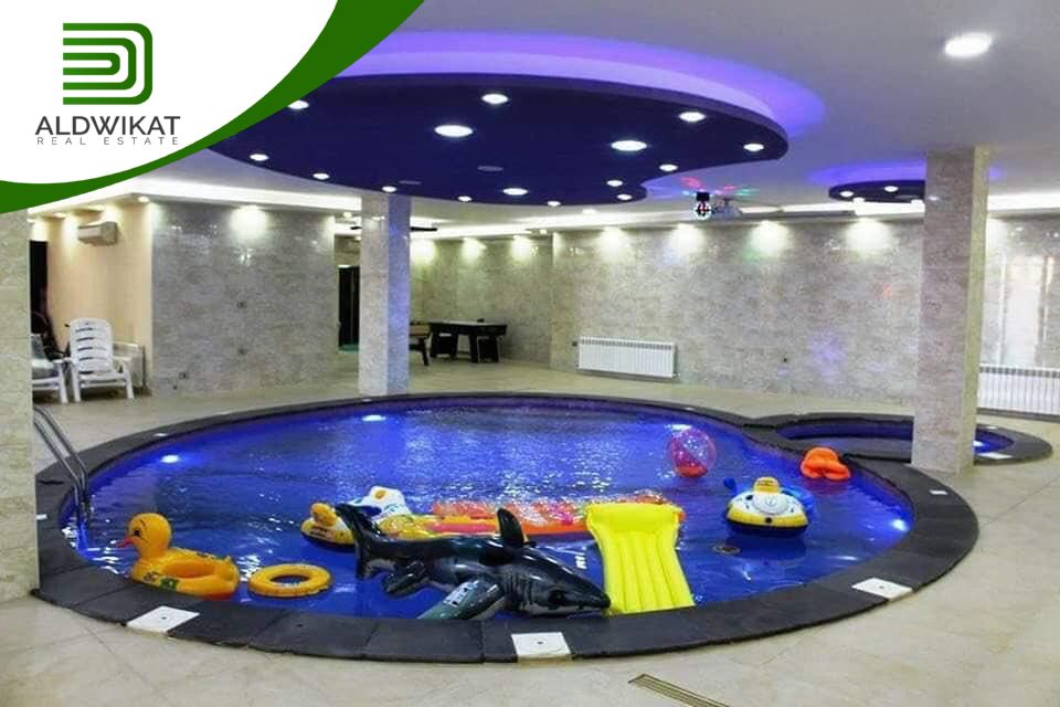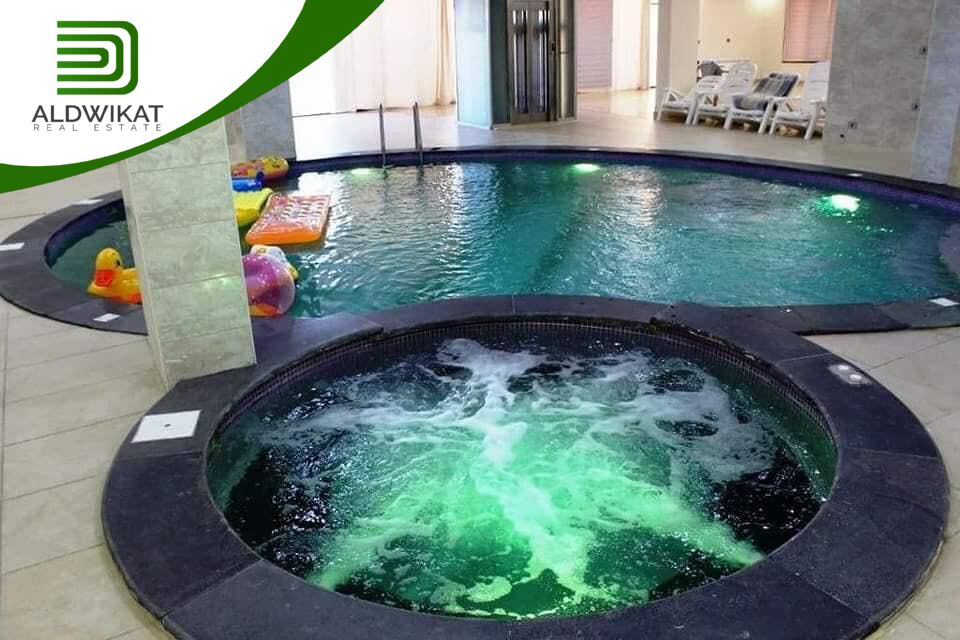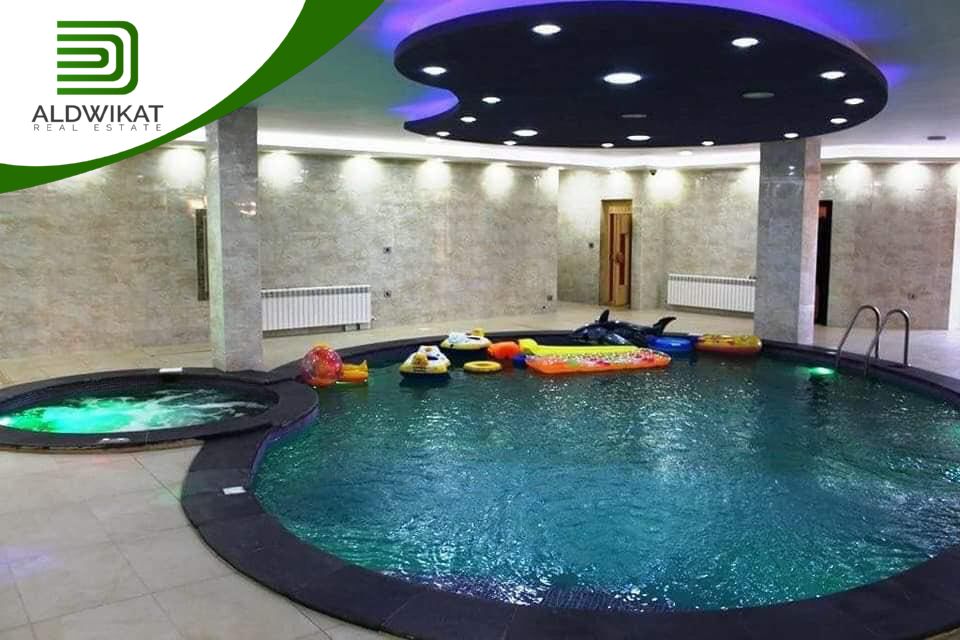 طابق التسوية : بركة سباحة داخلية مدفأه - جاكوزي - ساونا - مطبخ - مساحات للالعاب - منطقة جلوس واسعة - غرفةطعام - مرافق خاصة بالبركة - حمامات و شاورات - غرفة غيار - غرفة تخزين .