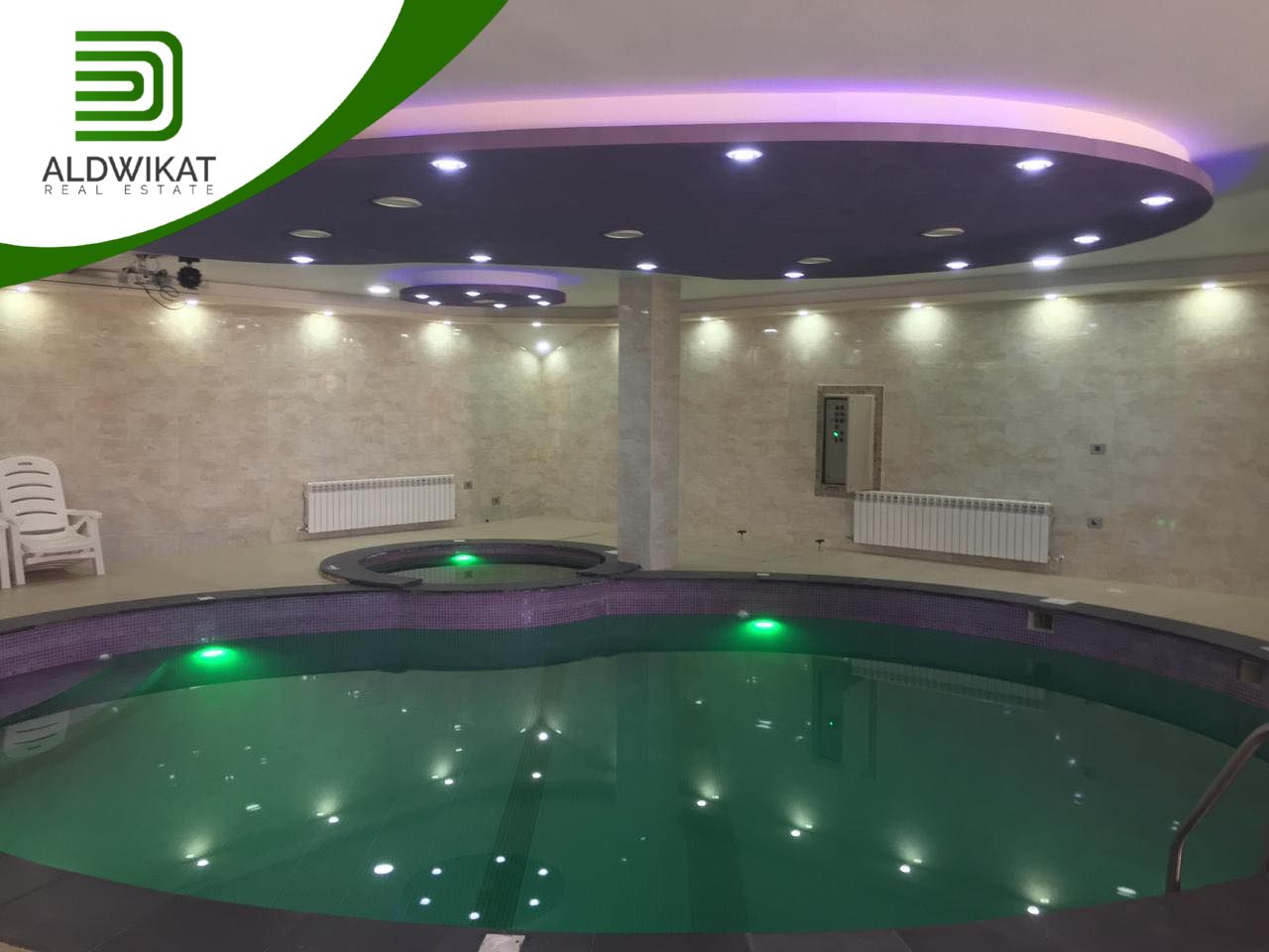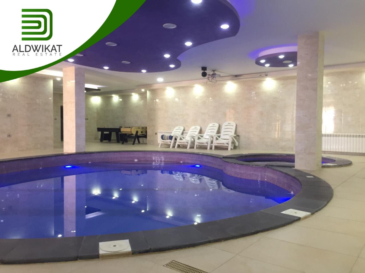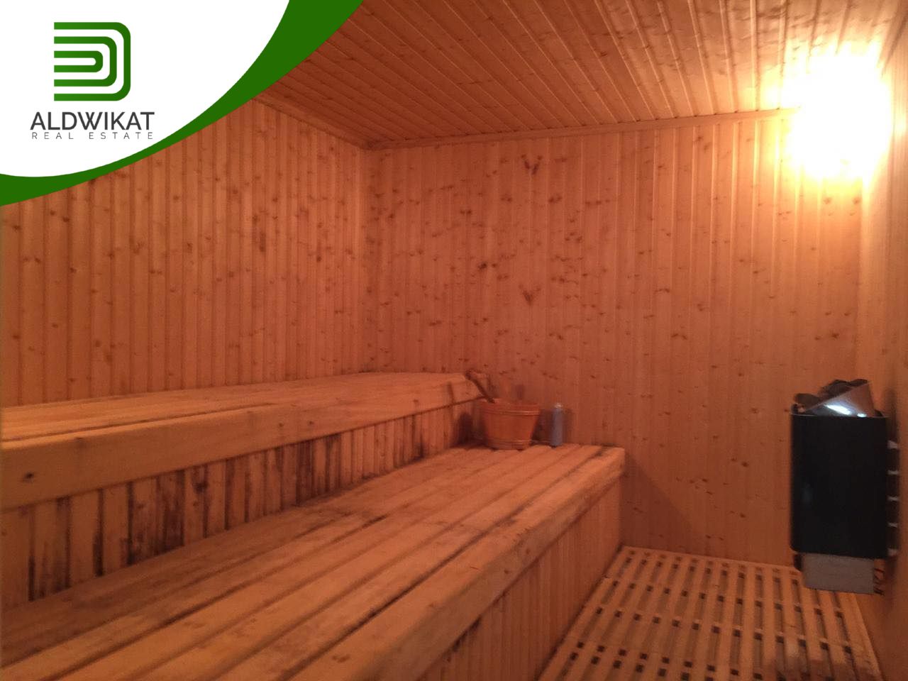 طابق التسوية : بركة سباحة داخلية مدفأه - جاكوزي - ساونا - مطبخ - مساحات للالعاب - منطقة جلوس واسعة - غرفةطعام - مرافق خاصة بالبركة - حمامات و شاورات - غرفة غيار - غرفة تخزين .